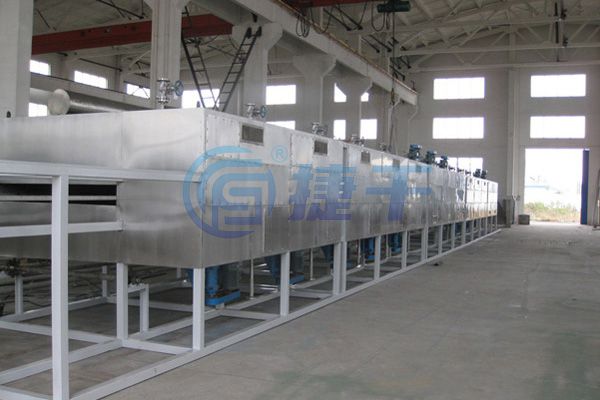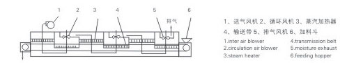 物料由加料器均勻地鋪在網(wǎng)帶上,網(wǎng)帶一般采用12-60目不銹鋼絲網(wǎng),由傳動裝置拖動在干燥機內移動。干燥機由若干單元組成,每一單元熱風獨立循環(huán),部分尾氣由專門排濕風機排出,廢氣由調節(jié)閥控制,熱氣由下往上或由上往下穿過鋪滿物料的網(wǎng)帶完成熱量與質量傳遞的進程,帶走物料水份。網(wǎng)帶緩慢移動,運行速度可根據(jù)物料溫度自由調節(jié),干燥后的成品連續(xù)落入收料器中。上下循環(huán)單元根據(jù)用戶需要可靈活配備,單元數(shù)量亦可根據(jù)需要選取。
