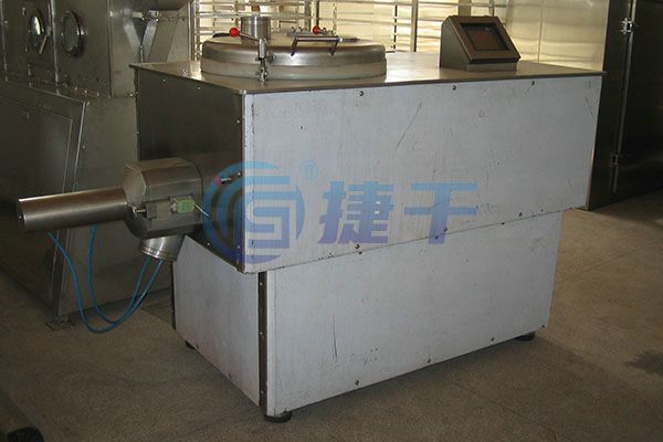粉體物料與粘合劑在圓筒形容器中由底部混合漿充分混合成濕潤軟材,然后由側(cè)置的高速粉碎槳切割成均勻的濕顆粒。
